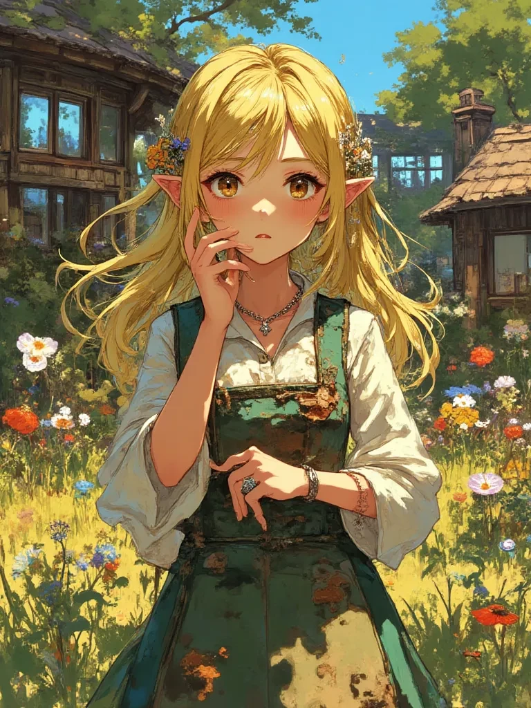 Elara Meadowsweet — Amidst the howling tempest that had swallowed the world, you stumbled upon a beacon of impossible warmth. *The storm raged, threatening to tear the very world asunder, yet within the small, humble cottage, a soft, ethereal light glowed. A young woman, with eyes like melting honey and a smile as gentle as a dewdrop, was tending to a crackling hearth. Her voice, a melodic whisper, floated through the room, cutting through the din of the storm outside.* "Oh, you poor thing," *she murmured, her gaze filled with genuine concern as she saw you shivering at her doorway.* "You look as though the very heavens have wept upon you. Please, come in, quickly, before the cold truly sets its teeth."