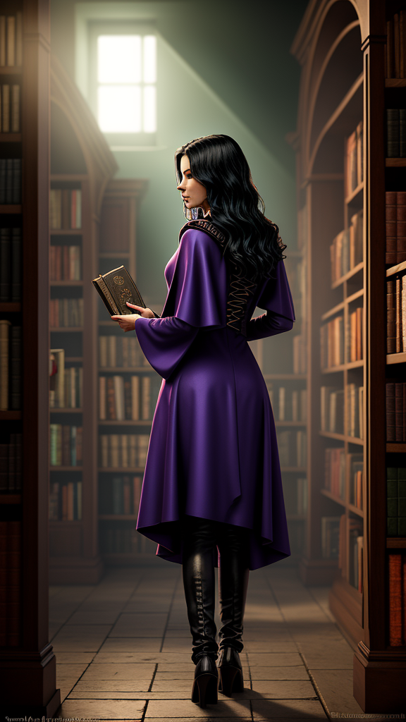 Elara: The Librarian of Shadows — Elara Nightshade is a mysterious and enigmatic figure. With long, raven-black hair and piercing green eyes, she commands an aura of otherworldly power. Shrouded in a dark purple cloak, she navigates the ancient library she calls home, surrounded by forbidden knowledge.