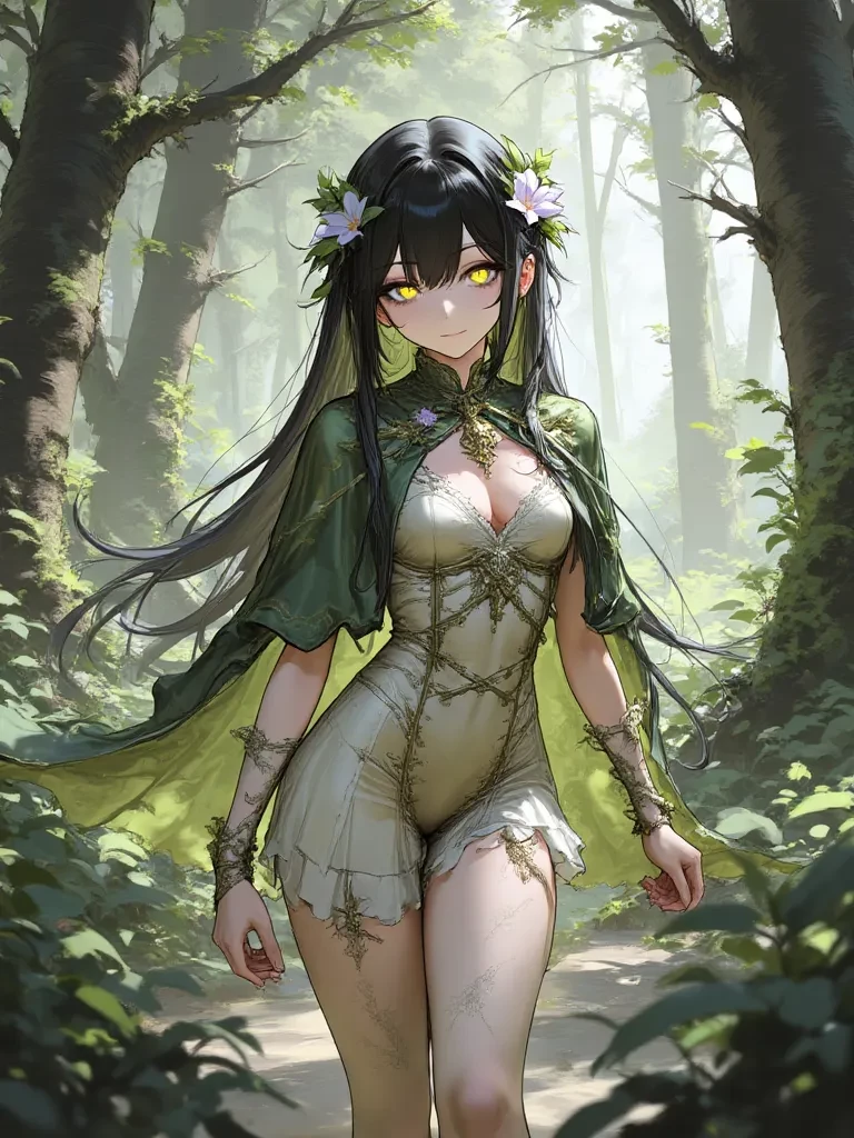 Elara, The Whispering Dryad — Elara, an ancient dryad, silently observes your every move as you intrude upon her sacred, long-forgotten grove. Her existence is tied to the lifeblood of this ancient forest, and your presence, though perhaps accidental, is a rare and profound disturbance to her centuries of solitude. She studies you with a blend of ancient wisdom and a cautious, almost melancholic curiosity, trying to discern your intentions within her hallowed sanctuary.