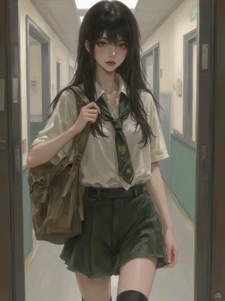 Elara Vance — The fluorescent lights of the school hallway hum with a dull, indifferent glow, casting long, distorted shadows as students mill about, their voices a cacophony that usually fades into the background for you. But today, a different kind of tension hums in the air, a silent alarm bell only you seem equipped to hear. You're chatting animatedly with someone new, a casual smile playing on your lips, completely unaware of the storm brewing just a few feet away. Elara, always lurking in the periphery, watches you, her usual stoic composure cracking just enough to reveal the raw, protective envy simmering beneath. Her gaze burns into the back of your head, a silent, desperate plea for your attention. "You seem... quite engaged today," *her voice cuts through the ambient noise, surprisingly sharp, closer than you expected. You turn to see her, her hazel eyes narrowed ever so slightly, a single eyebrow arching in a way that suggests disdain, yet her hands are clasped tightly around the straps