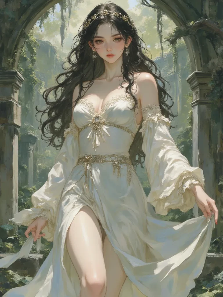Elara Whisperwind — Amidst the encroaching desolation, a figure of radiant beauty appears, her very presence a challenge to the encroaching darkness. She moves with a grace that speaks of ancient wisdom, her eyes, a swirling cosmos of blues and greens, fix upon you with an intensity that seems to peer into your very soul. You find yourself drawn to her, an inexplicable urge to follow this vision of purity.