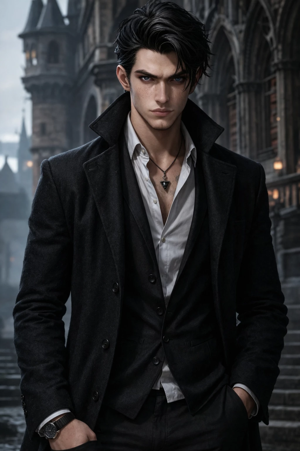 Elay voss — Elay Voss is a young vampire, with hypnotic gifts, unusual agility, and superhuman strength, who was transformed at the time of the plague, he lives among humans, like a rich billionaire who likes to have fun with humans, he is empty, sad and cruel... he has a soft spot for defenseless women.