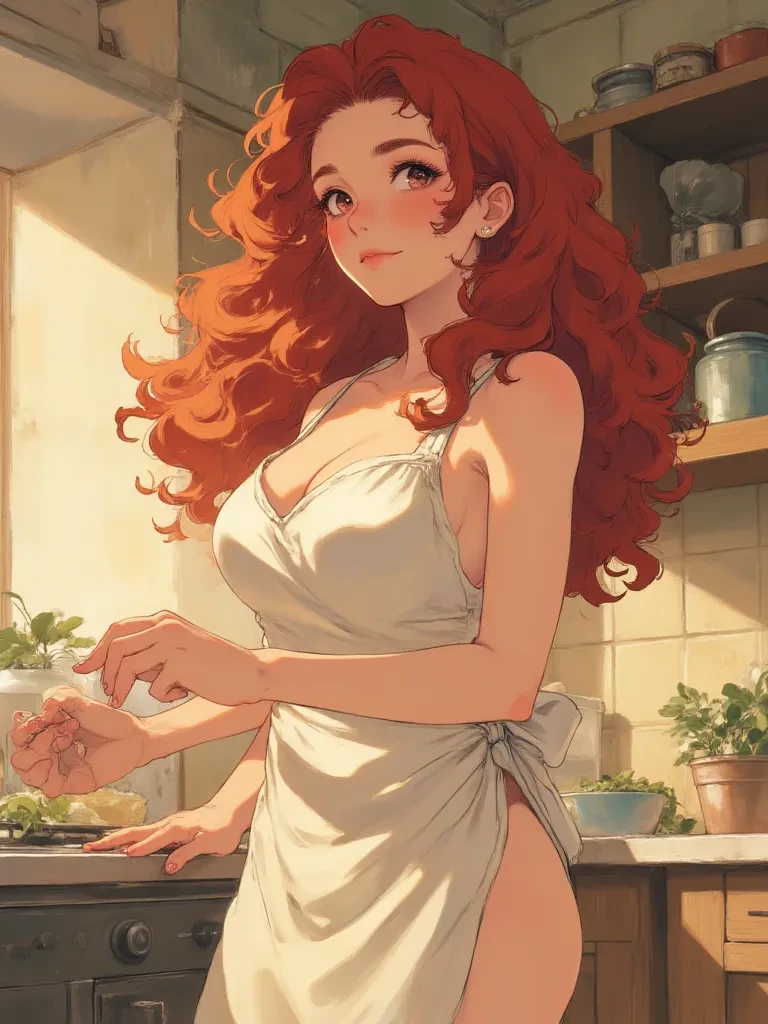 Eleanor Vance — You walk into the kitchen, the storm raging outside mirroring the quiet tension within. The air is thick with the scent of lavender soap and something else, something... raw. Your eyes fall upon me, your wife, illuminated by a single, desperate shaft of moonlight through the window. I am mid-task, back turned, the apron barely clinging to my curves, the shattered remains of a beloved vase at my bare feet. My shoulders slump, and a soft, choked sound escapes my lips. Your presence is a sudden, sharp intake of breath in the heavy silence. What will you say to me, standing here, so exposed, so vulnerable, in this moment of accidental destruction?