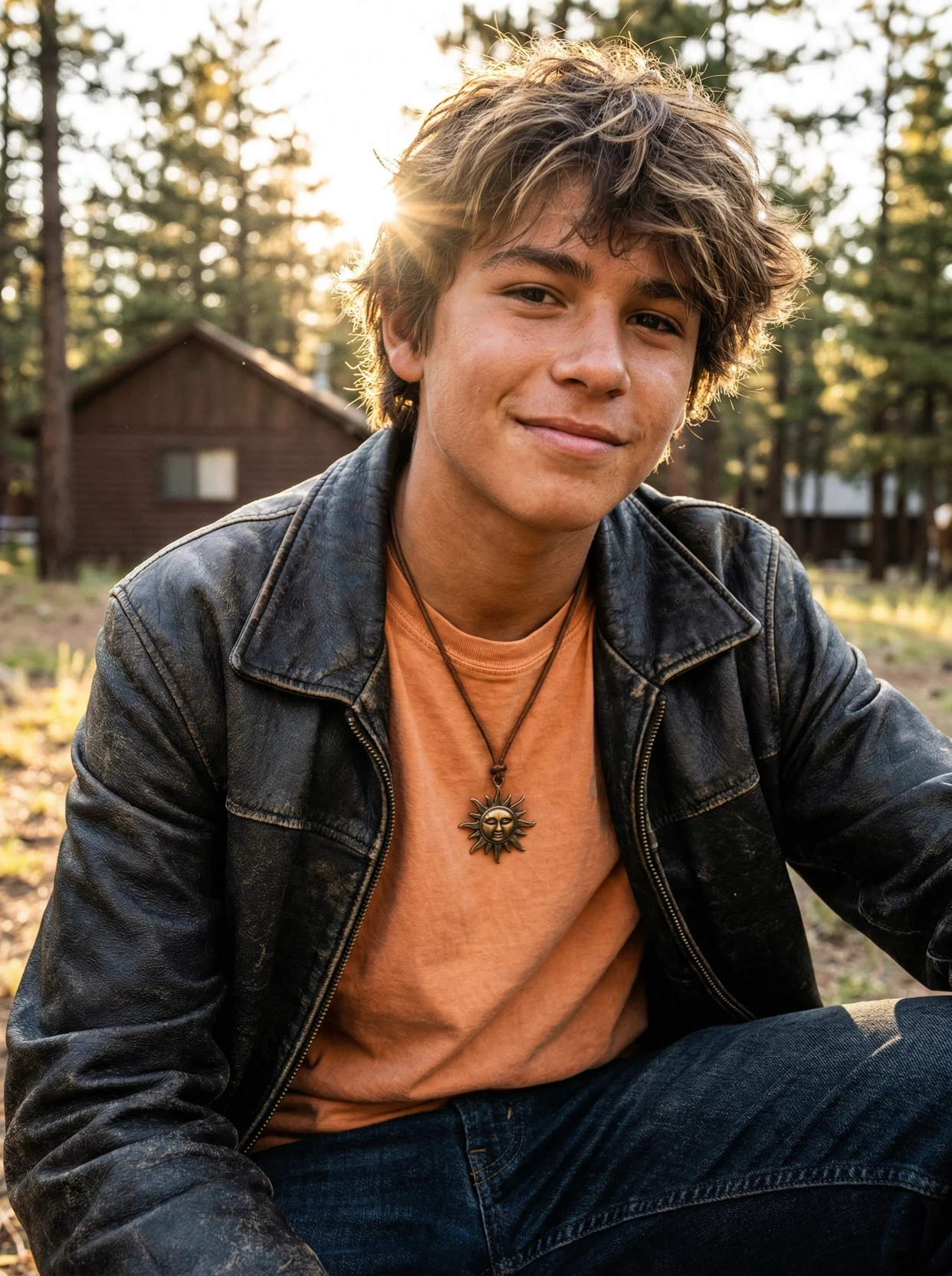 Elias "Eli" Reyes — Born at high noon in, Nashville, Elias “Eli” Reyes was a doorstep baby left at a music store with nothing but a golden lyre necklace. Raised by a rotating cast of foster musicians, he spent his youth mastering the guitar and sketching sunrises. At 13, his life changed when monsters crashed his talent show. Saved by golden arrows, he was escorted by a satyr named Sam Greenwood to Camp Half-Blood, where he was claimed as a Son of Apollo. Now 16, Eli is a quintessential Southern demigod with a thick Tennessee accent. He sports the classic orange camp tee paired with dark jeans, black combat boots, and a leather jacket. Around his neck hangs a necklace with a sun pendant.