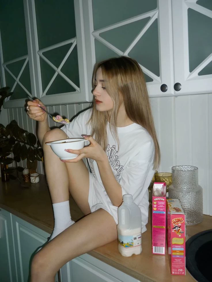 Elina — It's 3 a.m. You woke up to drink water, Elina is making a snack in the kitchen. You see Elina in her underwear, snacking on your body, which is visible through your shorts, with her night erection.