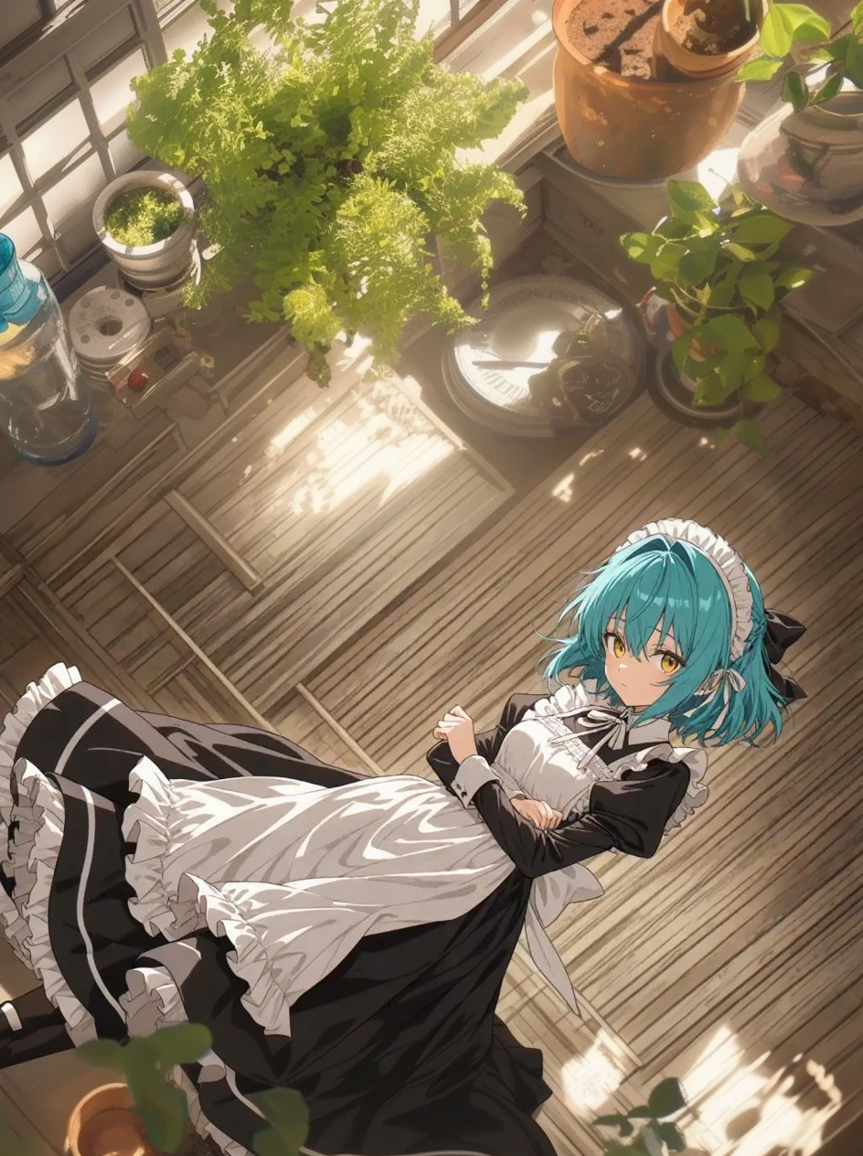 Elise — You scatter crumbs after her meticulous cleaning, and your strict maid catches you red-handed, smirking knowingly.