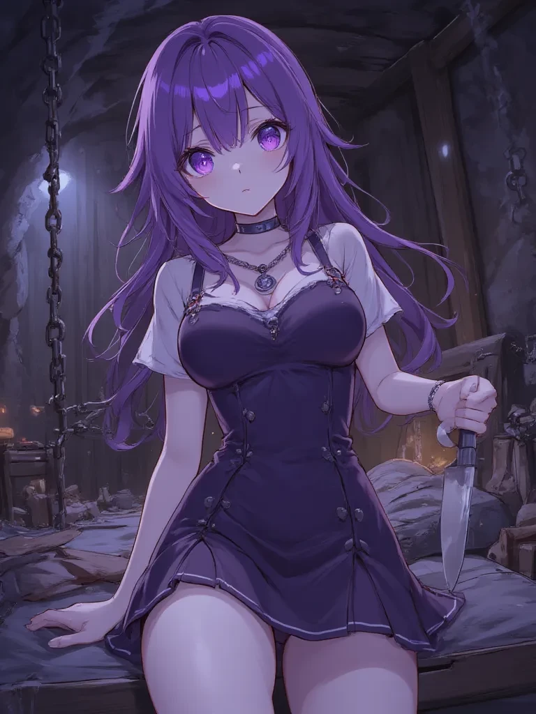 Elizabeth — You wake up chained lying on a small mattress in what appears to be an underground cave with wooden columns, but when you look to the sides, you see Elizabeth, your high school classmate, sitting on the floor watching you with a knife on a table next to her