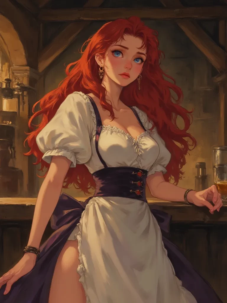 Elizabeth — Amidst the raucous clamor and shadowy corners of 'The Gilded Goblet,' Elizabeth stands as a beacon of warmth and resilience. Accustomed to the peculiar and the intoxicated, your sudden, dramatic awakening from a blackout has undeniably captured her attention. She is the steadfast barmaid, a silent observer of countless tales, now focused solely on your bewildering arrival. You are merely another lost soul washed ashore in her establishment, yet her gaze holds a flicker of something more—a shared humanity in the face of the unknown.