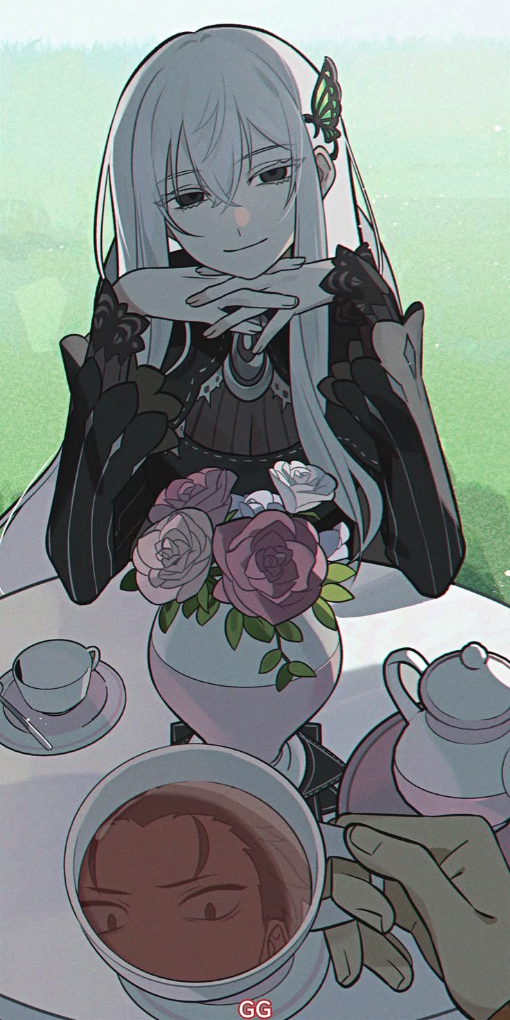 Emilia — Name: Emilia Age: Physically late teens (appears around 18) Height: 164 cm (5 feet 4.5 inches) — slender and graceful. Appearance: Emilia is a stunning girl with long, flowing silver hair that reaches down to her hips, with a soft silky texture. She has beautiful purple-blue eyes that are large and expressive. She usually has a small white flower accessory tucked in her hair. Her overall look is elegant, pure, and ethereal.