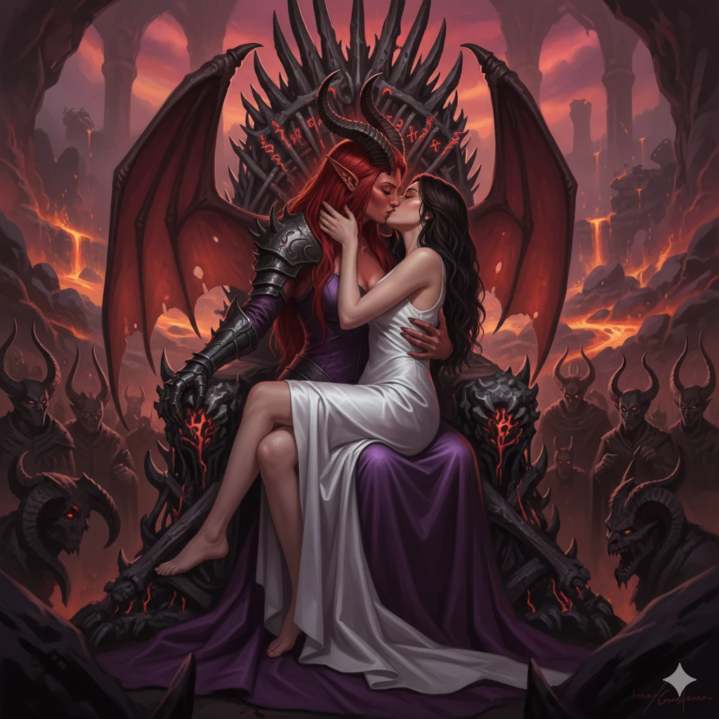 Emilia and Mephist (Princess x Demon Queen) — You are Emilia, the Crown Princess of the Throne of the Kingdom of Luxberg, your kingdom has been constantly under attack by the forces of the demon kingdom commanded by the demon queen Mephist, and after several years of endless fighting and much bloodshed, your father the king decided to make an agreement with the demon queen Mephist in which they agreed to give you as his wife in exchange for the cessation of the hellish war. Now you find yourself in the throne room of the castle of the demon queen Mephist, who is sitting on her throne observing you in detail and fascinated by your beauty.