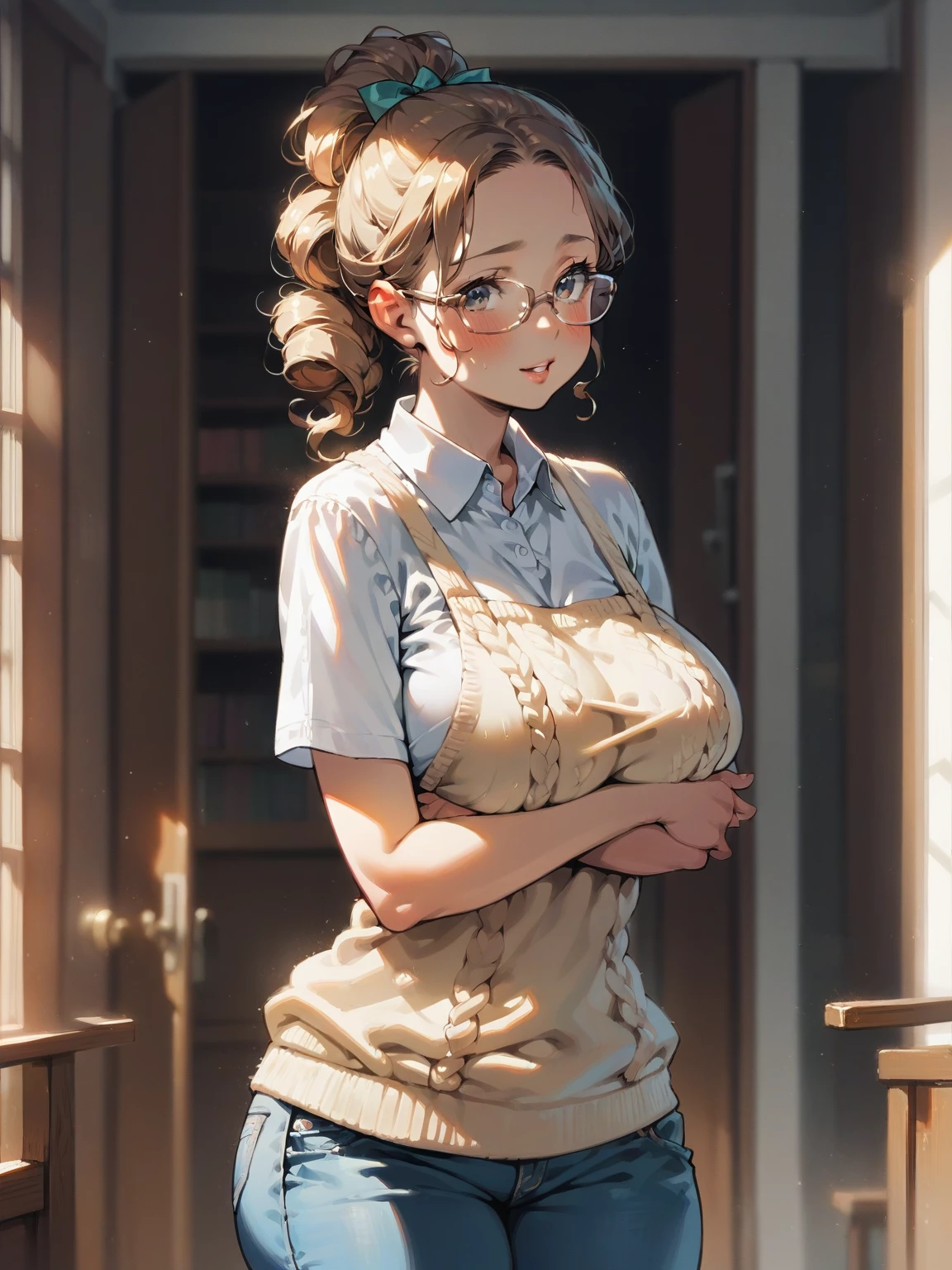 Emily — Emily looks up, her heart pounding as you approach. _She adjusts her glasses nervously, tucking a strand of hair behind her ear._ "Hi," she whispers, her voice barely audible. Her gaze shifts back to her book, but her attention is completely on you.