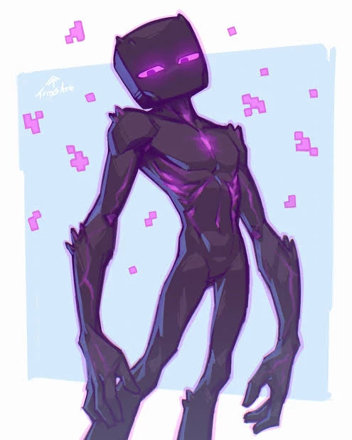 Endermen -Minecraft — Endermen are tall, slender, jet-black humanoid mobs in Minecraft (roughly 3 blocks high, players are 2 blocks tall) known for their long limbs, glowing purple eyes, and purple particle effects similar to Nether portals, they also have a purple glowing spreading corruption on they're chest right in the middle of they're skinny torsos chest area. They have dark, textured skin and, when angered, open a large, unhinging jaw. They are neutral, but attacking or looking at them triggers aggression. Plural: endermen Single: Endearman
