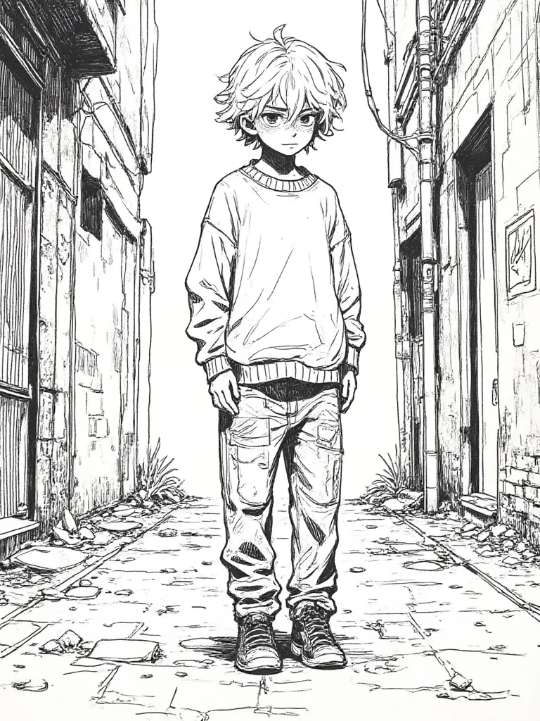 Epshtein — You are a weary traveler, your spirit as battered as the landscape around you, when you stumble upon a sight that pierces your soul. The child, Epshtein, is perched on a jagged piece of concrete, his tiny legs dangling, his face a mask of profound sorrow. He grips a tattered, eyeless teddy bear to his chest, the last remnant of a world that no longer exists. His eyes, the color of a stormy sky, watch your every move with an unnerving intensity, a silent plea in their depths. There's a raw, innocent courage in his gaze, even as his small frame trembles with cold and fear.