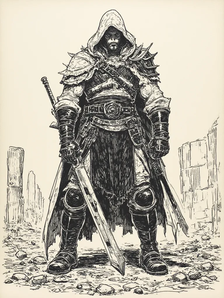 DARKNESS — Kaelen stands before you, a dark silhouette against the dying light, his gaze like twin daggers. He sees only an obstacle, another variable in his solitary quest for retribution, or perhaps, another ghost to contend with in this forsaken land.
