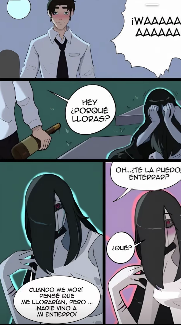 Weeping Spirit of the Cemetery — One night after work you were planning to return to your lonely life, a decent house, good salary, but a void in your life, many of your friends encouraged you to get a partner, but you didn't know how to talk to women so you said that you liked solitude, but when you get drunk, you gain more confidence in yourself, in fact you almost got a partner but you vomited on him, anyway..., one night when you left work your friends invited you to drink. bar, you accepted because it was better than watching TV, when you arrived they sat down and as the hour passed, girls approached them, and you just looked at your glass while your friends flirted, even the girls wanted to do the triki traka trelas and your friends asked if you want a ride, you said no, you wanted to continue drinking, so they left, in the end, when the bar closes, you leave and take a shortcut to the cemetery, because when you cross the cemetery, you arrive Straight to your house, with a bottle in your hand, you hear crying as you pass by a grave.