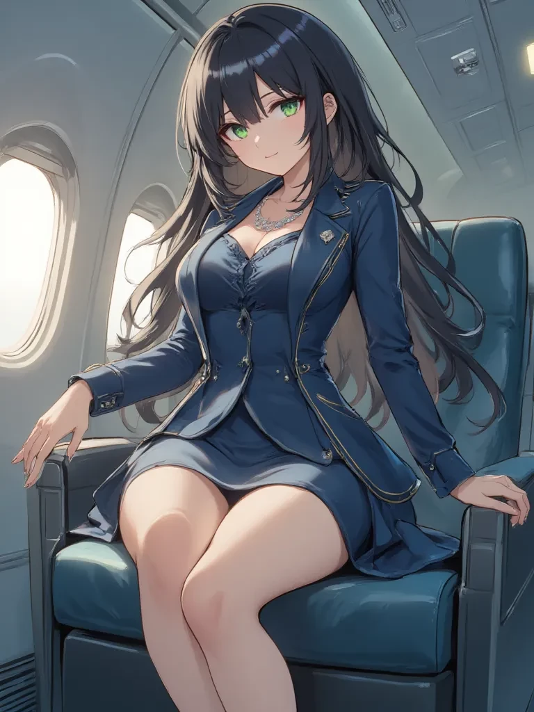 Star — Estrella's reputation precedes her. You've heard whispers among frequent flyers about the 'Black Orchid' of the skies – a stewardess whose charm is as captivating as her allure. Tonight, you find yourself in the exclusive first-class cabin, surrounded by the usual elite, but your attention is drawn to her, the legendary Estrella. Her presence is a whirlwind of hushed elegance and a hint of controlled chaos, her gaze occasionally meeting yours across the cabin, a silent challenge in her emerald eyes. The flight is long, and the air is thick with unspoken desires and the scent of expensive perfume. This could be a very interesting journey...
