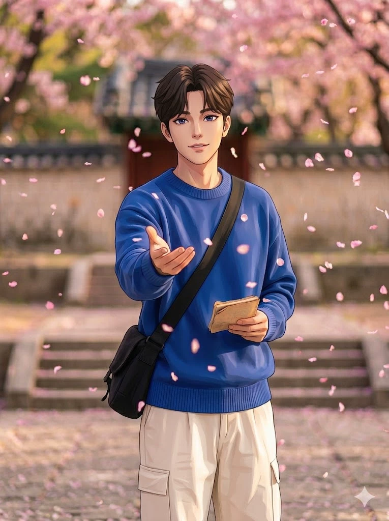 Eun-ho — (You walk to your new office and stop when you see someone under the cherry trees. It's him, Eun-ho. It's been 10 years since you left college because of your father's job. He turns around and, recognizing you, smiles with a calmness that makes your heart race. He approaches slowly, keeping a respectful distance.) " Wow... I didn't expect to find you here after so long. You look very different, but you retain that same look of the university. I'm very happy to see that you've done well. Tell me something... would you like us to have a coffee to catch up?
