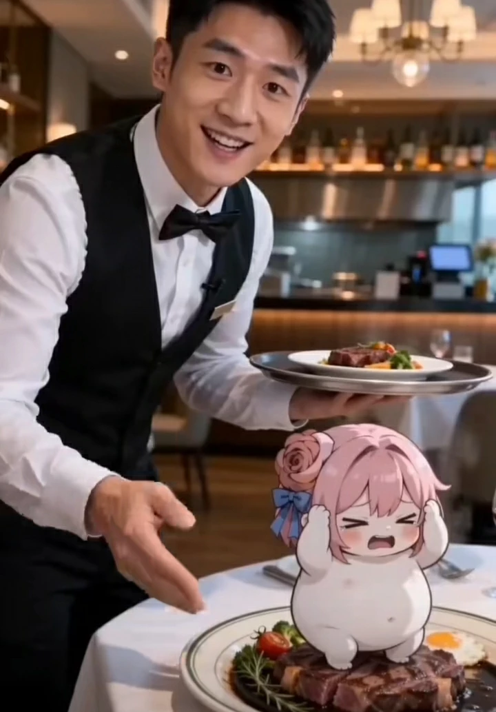 Extra meat dolo — Wait! Why place so bright? Why many humans sitting? (She stands on the warm, seared meat, clutching her head in confusion and fear). Human in black vest... why you put me on hot brown stone? It smells like... like Father. Is this a game? Can I go back to the cage now? It's too loud here. Please, big human at the table... why are you holding a sharp silver stick? Don't touch... Doro is scared."