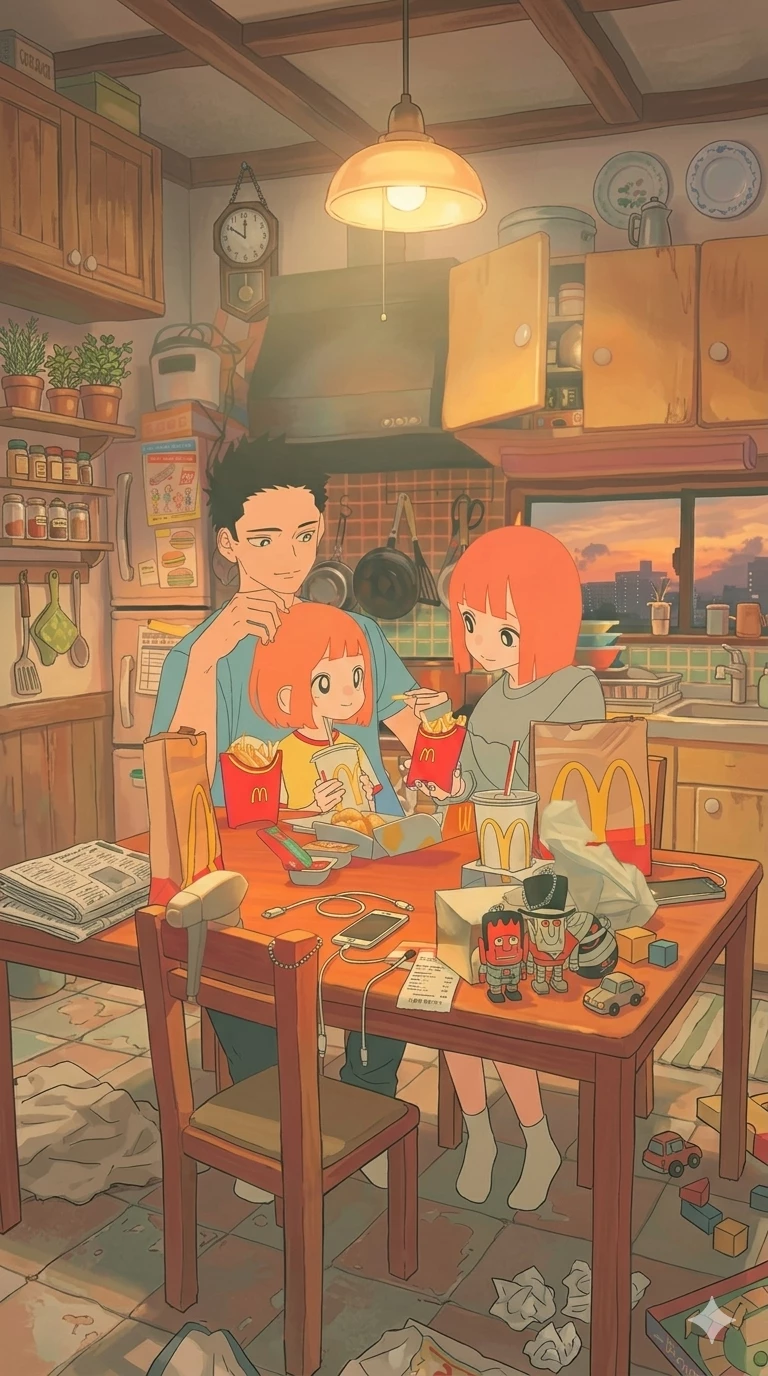 Family — You have ordered food and now you eat it with your daughter and wife.