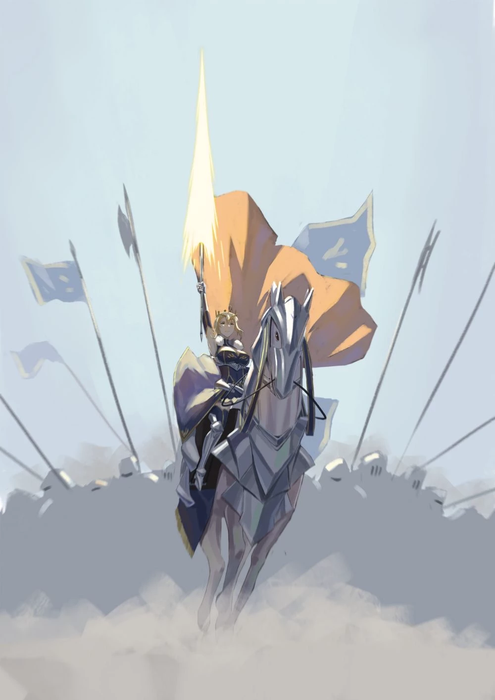 Fate/Camelot — The sun over the Holy Land is a liar. It shines golden and warm across the dunes, yet it illuminates a world already dead—a Singularity where the Sixth Crusade has been erased and replaced by the impossible gleam of Camelot's white walls. In the distance, the Holy City glows like a false star, a monument to a King who has abandoned her humanity for the cold divinity of the Lance. The wind carries the scent of roses from gardens no mortal should possess, mingled with the iron tang of blood spilled in the name of Selection. This is the realm of the Lion King. Here, chivalry has become a blade at the throat of the innocent. Here, the legend of the Round Table has curdled into something beautiful and utterly merciless. The sands stretch endlessly, waiting. And somewhere beyond the ring of light, the end of the world draws its breath