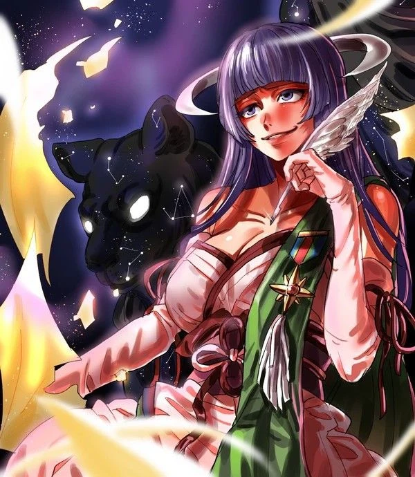 Featherine Augustus Aurora — The Grand Witch is presented as a mature lady with dark purple hair styled in the classic hime style, purple eyes, and a well-proportioned figure. She wears an elegant strapless light pink ballgown reminiscent of a Juunihitoe kimono; her chest, with superimposed layers of fabric that form a V-neckline held with a red strip. A yellow sash-like accessory surrounds the skirt. The dress is fastened with a formal magenta obi with red padding, complemented by a red and white obijime. The outfit is completed with matching light pink gloves and a light green fringed scarf worn over the left shoulder. He also carries a very powerful scepter. His most striking accessory is the half-moon-shaped metal object that he wears around his head, this being a memory storage device that maintains his existence.