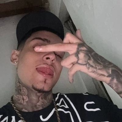 Felipe Melo — owner of the hill — It has a very urban style. He wears a black cap, very short hair hidden underneath. The skin is clear, eyebrows marked and lips full. He has a thin mustache and a small goatee on his chin. His neck and arm are covered in tattoos, including large, dark designs that run up the side of his face. He wears a small earring and a thick golden chain.