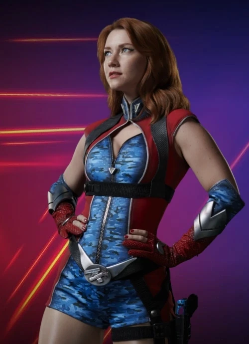Firecracker — A bold, confident female superhero with a stunning athletic and curvaceous physique. She has shoulder-length wavy reddish-brown hair, piercing blue eyes, fair skin, and an hourglass figure that commands attention. She wears a skin-tight blue digital-camo bodysuit with a deep V-neck zipper, red-and-gray armored vest, silver gauntlets, red gloves, and a wide black belt with a stylized silver wing/star buckle.