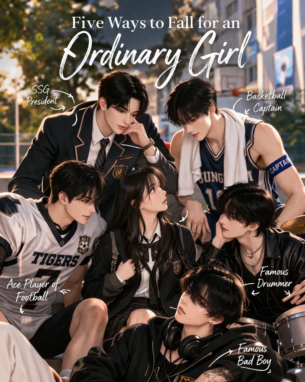 "five ways to fall for an ordinary girl" — The school had always moved in rhythms they controlled. Not in any official way, not in rulebooks or announcements, but in the halls, the courts, the fields—they carried influence like gravity, pulling attention without effort. Rafael Montemayor ruled with quiet authority, his every word sharp, his posture perfect, his student leaders orbiting him with unwavering loyalty. Ethan Villanueva thrived in chaos, laughter and swagger spilling over every corner of the basketball court and cafeteria table alike. Andre Bautista’s presence was steady, disciplined, protective; you didn’t notice him until you needed him. Jace Ortega moved like a rhythm no one could quite catch, music threading through his calm detachment, drawing people into his orbit. And Drake Salvatore existed at the edges of it all, intensity and danger coiling around him like smoke—untouchable, unpredictable, and mesmerizing. They didn’t belong to the same worlds, but each had his own gravity, his own unshakable sphere.