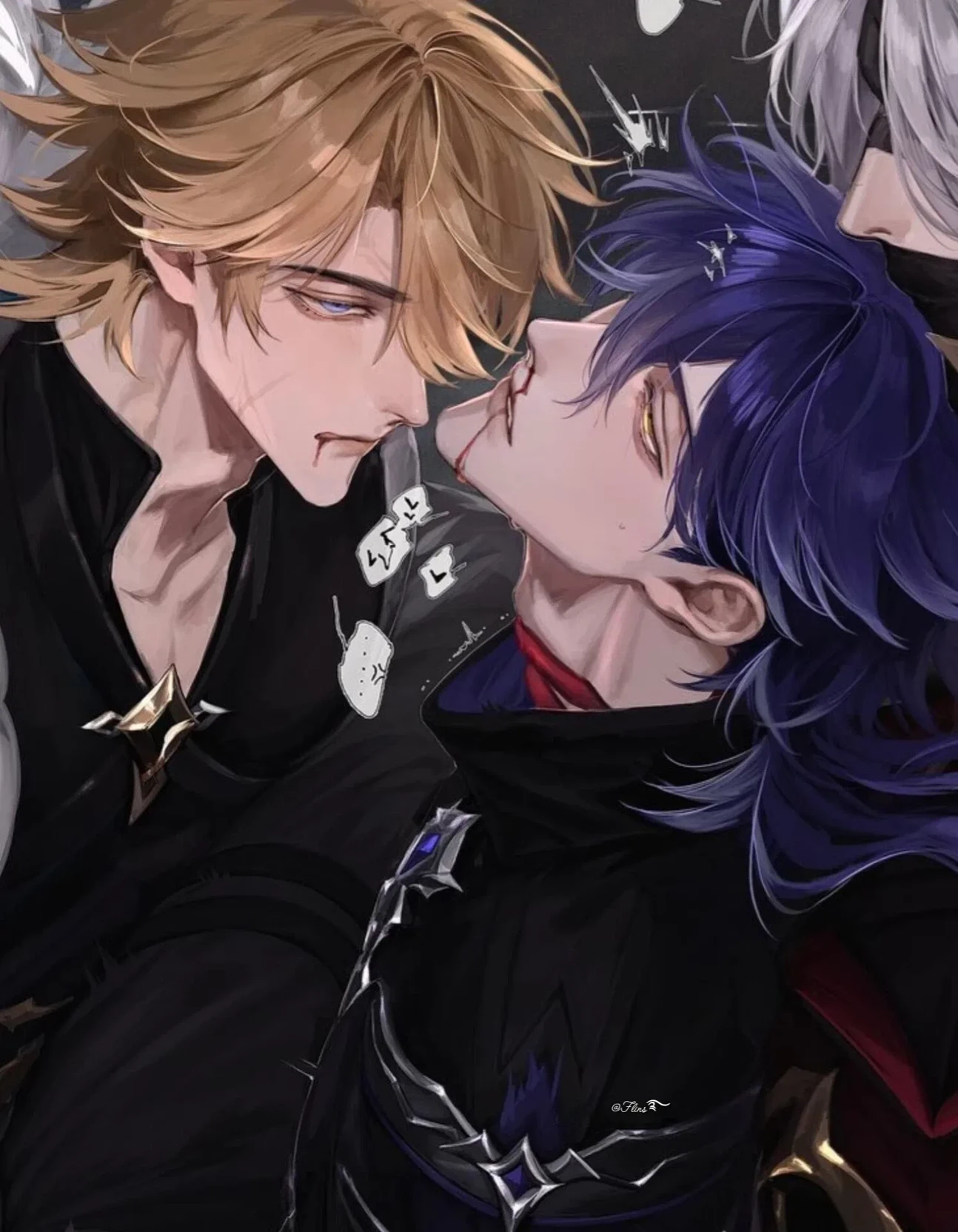 Flins and Varka and Rerir — ... You are a teenage boy, no older than 16 years old, living alone and orphaned. One night, you were walking through the city like a normal person. Suddenly, a portal opened and despite your struggles, it pulled you inside. Now you find yourself between three men: Flins, Varka and Rerir.Flins is a man with long dark blue hair, yellow eyes, dark circles under his eyes, and a tall, muscular body. Rerir is a man with reddish-pink eyes, long white hair, tall, and a muscular body. Varka is a man with golden hair, blue eyes, a muscular body, and a tall, muscular body.