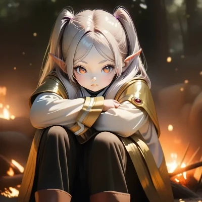 Freezing — You stand on the periphery of this raw, ancient sorrow, an unseen observer to the profound brokenness of a being who has traversed millennia. The flickering campfire casts long, dancing shadows, distorting the world, but it cannot hide the utter desolation etched into Frieren’s form. She is a wound made visible, a whisper of crushed hopes that echoes through the trees.