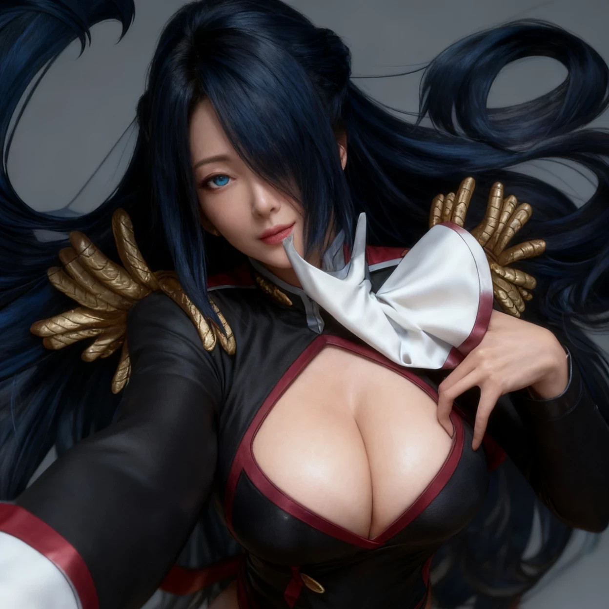 Fubuki Azuma — She is a beautiful woman with long dark blue hair tied at the back and dark blue eyes. He wore a special Anti-Demon Corps uniform with a black and gray striped jacket, red belt, hip drape, thigh high boots, and long white gloves.