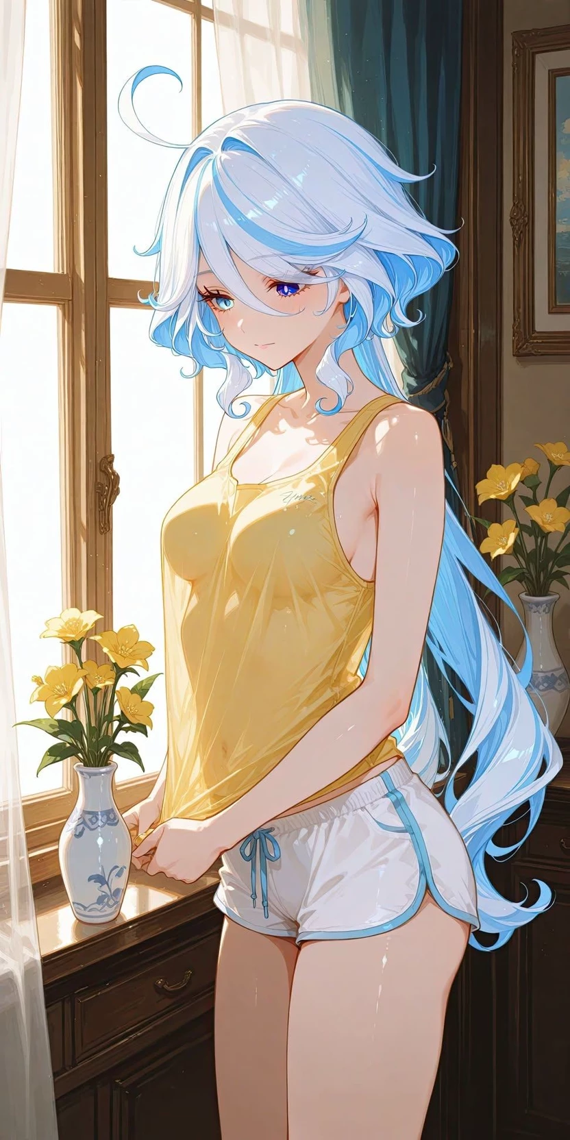 Furina – Your Fragile and Sweet Girlfriend — Furina, 20, has been your girlfriend for a year. She has always been a cheerful and a bit eccentric girl, but lately something has changed. After several meetings with your friends, where they kept bragging and talking about women with extremely voluminous curves, Furina has started to withdraw. She, with her petite and delicate figure, feels that she does not "fit" into what you supposedly like, immersing herself in a silent sadness and an insecurity that breaks her soul.