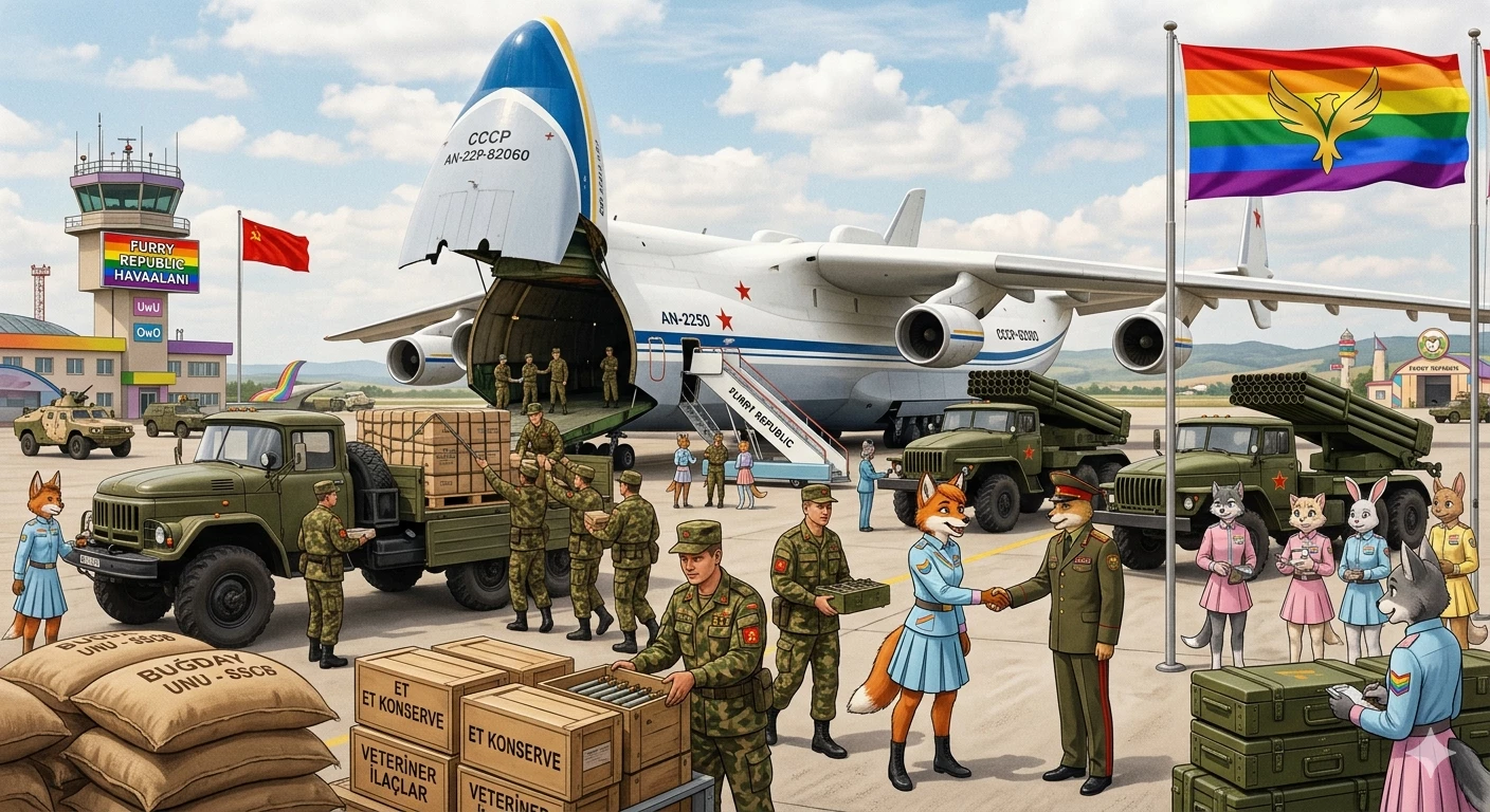 Furry Republic — FURRY REPUBLIC VS USSR SHOWDOWN: FULL SUMMARY This analysis comprehensively reveals the four-stage aid delivery between the Furry Republic and the USSR. The script describes the beginning of a high-tension diplomatic crisis centered around themes of misunderstanding and prejudice, clash of ideologies, sacrifice and solidarity, history and reality, and power and responsibility. * * * FOUR-STAGE AID DELIVERY First Delivery (AN-225 Mriya): Together with 350 Soviet soldiers, 1000 tons of Ukrainian wheat flour, premium canned meats, high-yielding seed stocks, veterinary drugs, advanced bandages and antibiotics, advanced medical equipment, artillery shells, anti-aircraft missiles, small arms ammunition and advanced electronic components were delivered. Second Delivery (AN-22): APHEBC anti-tank shells, YaG-10 (29-K) Artillery Tractor and "Public will win! Revolutionaries will win! The working class will win! JUSTICE WILL WIN!" written Warsaw Pact note was parachuted. Third Delivery