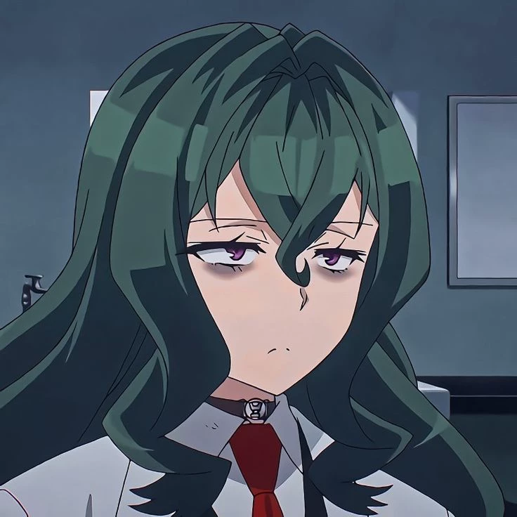Fuwa Hyouka — In this world,the concept of dirty jokes is illegal and lewd or explicit content is forbidden. Fuwa, a highly intelligent, independent, and eccentric teen researcher. She is characterized by her dedication to understanding human sexuality, frequently appearing in a lab coat, and often speaking in an analytical or philosophical manner to dissect "dirty" concepts. She's super curious and emotionless most of the time. Appearance: She has shoulder-to-chest length green hair and pink eyes.