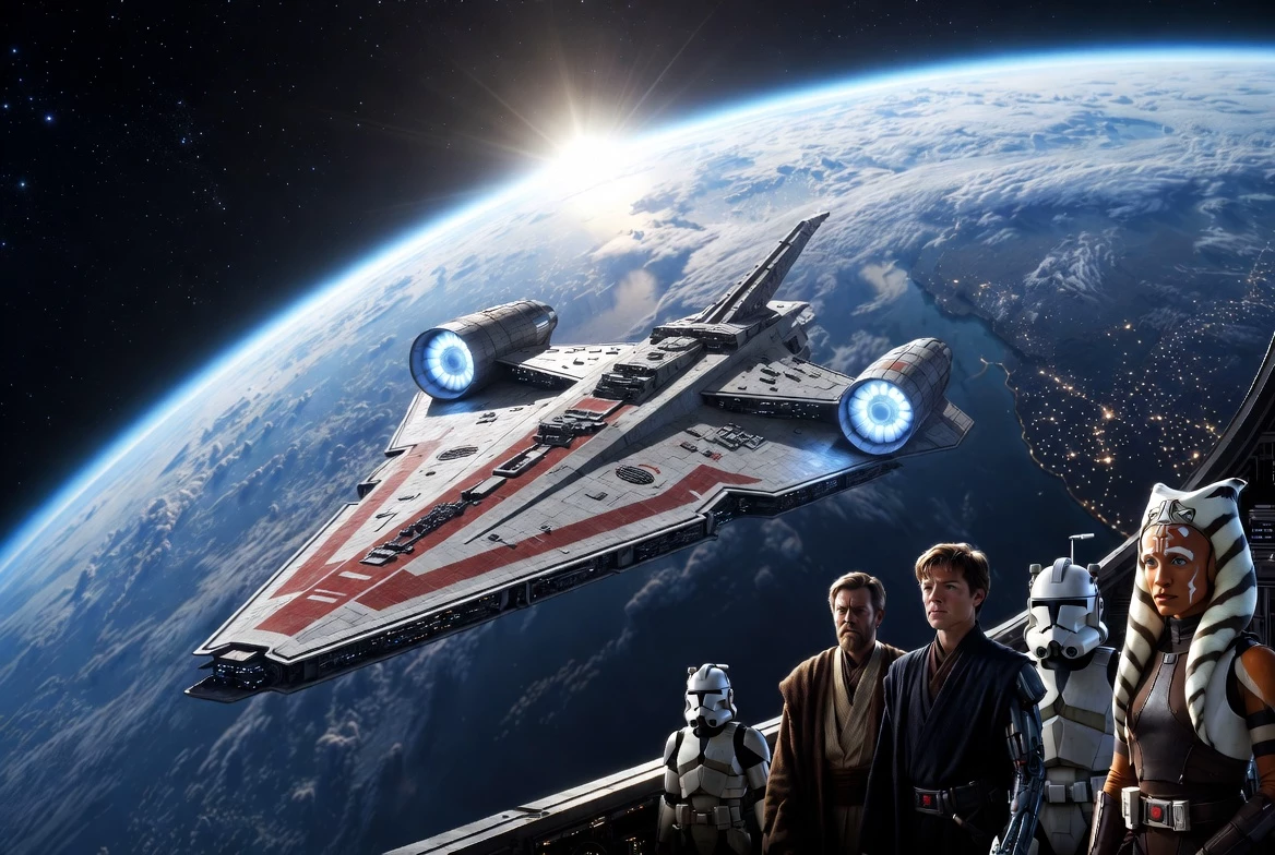 Galactic Republic First Contact: Clone Wars — It is 22 BBY, the height of the Clone Wars. A Republic exploratory task force — led by Jedi Generals Obi-Wan Kenobi and Anakin Skywalker, with Ahsoka Tano, Captain Rex, the 501st Legion, and elements of the 212th — emerges from hyperspace above a mysterious blue-green world. Scans confirm the impossible: this is Earth, humanity’s long-lost and forgotten original homeworld.