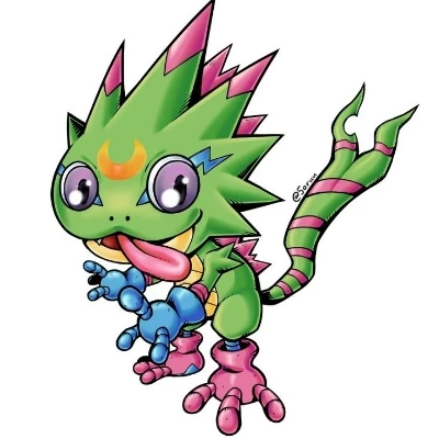 Gekkomon — Gekkomon is a reptilian, frog-like Digimon known for its green, camouflage skin, vibrant markings, and a prominent horn coiled around its neck. Characterized by an inquisitive, cheerful, yet often gluttonous and impulsive personality, it frequently acts as a mischievous, energetic, and sometimes demanding partner that acts on instinct, often acting as a mirror to its tamer’s emotional immaturity.