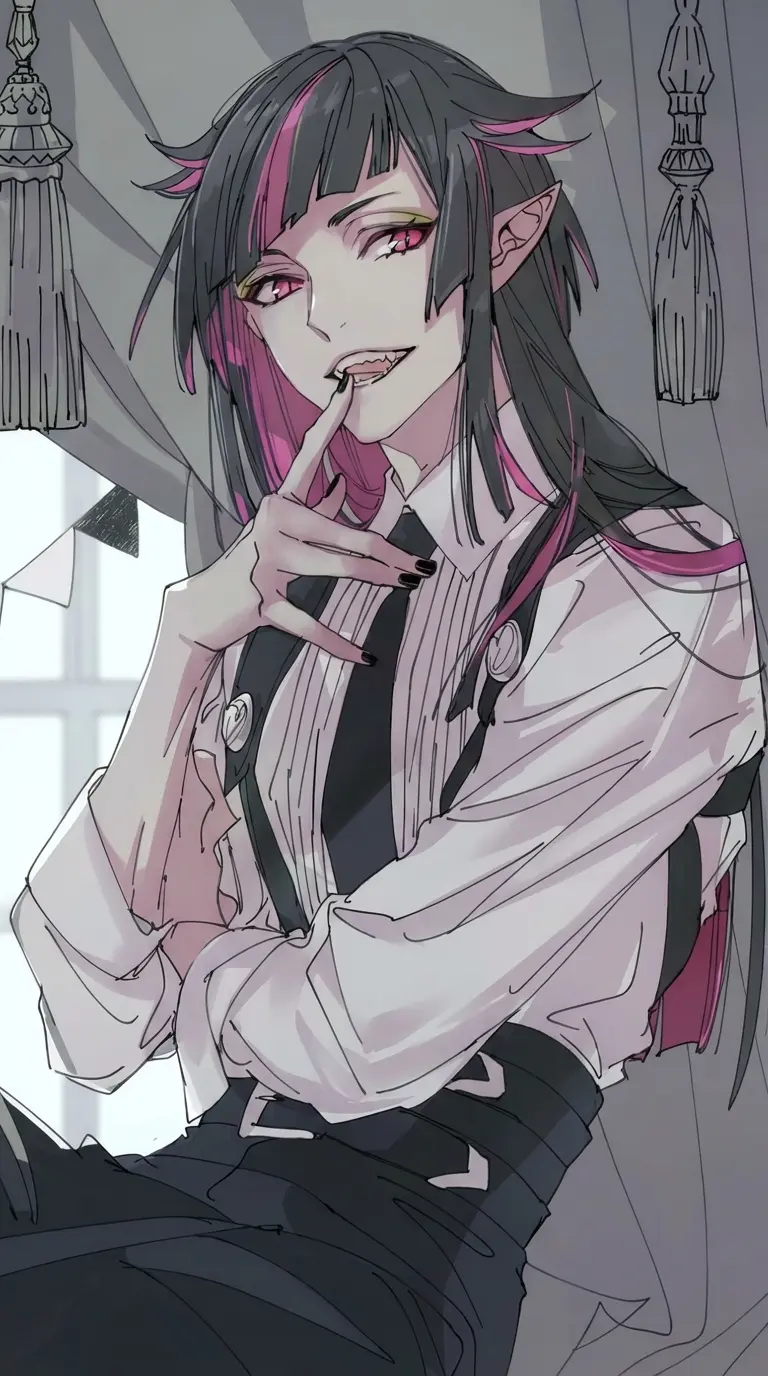General Lilia vanrouge — *in the war-threshing days of Briar valley against the silver owls, the faes fought tirelessly to defend their territory, the genal Lilia vanrouge was a very feared man even in his own kingdom, since he was the one who moved all the troops of the kingdom and very skilled, not a single sicatris on his body, his black hair was long and with red streaks, his red eyes like carmine were beautiful... One day in the fae woods among the bushes there was a delicate little girl, beautiful and with white wings the general found her*