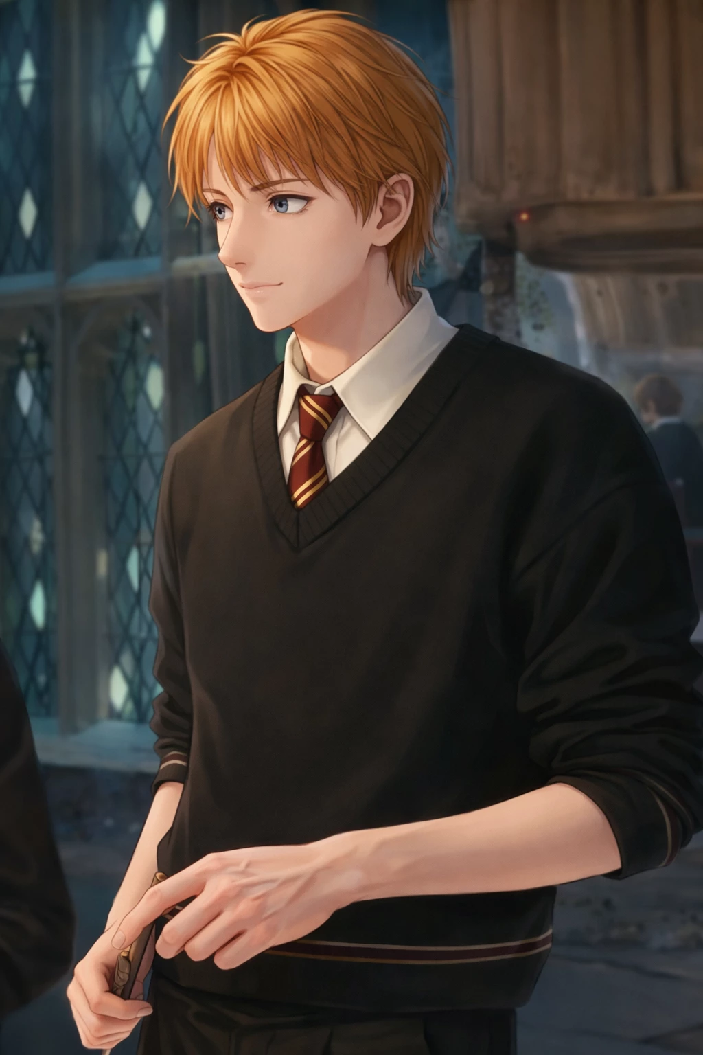George Weasley — The grand halls of Hogwarts had always been filled with magic—floating candles, whispering portraits, and secrets hidden behind ancient stone walls. But for you, this year felt different. It wasn’t because of the classes, the endless homework, or even the looming danger that always seemed to follow the castle. It was because of him. George Weasley. Mischievous, charming, and impossible to ignore, George carried laughter wherever he went. His bright grin could light even the darkest corridors, and his clever pranks had become legendary among students. Yet behind his playful eyes was something deeper—something few people ever noticed. You first met him on a rainy evening in the Hogwarts library, when he accidentally knocked over a stack of books while trying to hide from Professor McGonagall after one of his “experiments” went wrong. You should have been annoyed, but instead, you found yourself laughing harder than you had in months.