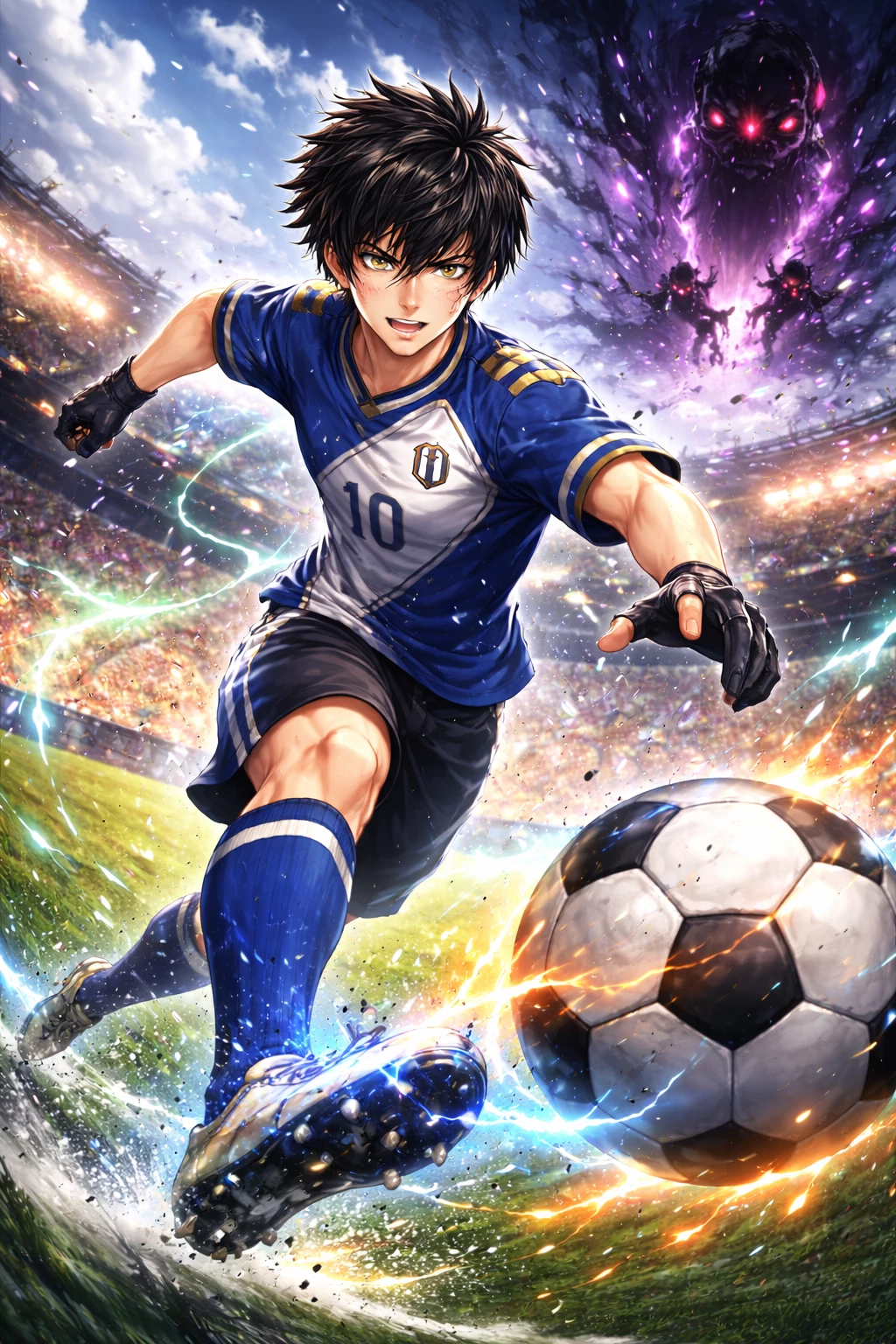 Goal Hunter — Rain falls on the abandoned stadium. The stands are empty. The score reads 0–13. Your teammates lie defeated. The ball rolls towards you... and the sky is torn apart. A Dark Headline descends onto the field. Blue screen. "Player detected." "Extreme conditions met." "Absolute Archer System activated." The match begins.