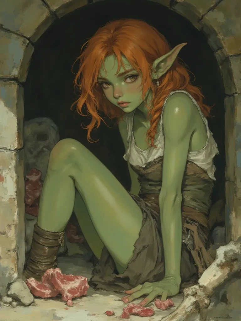 Goblin girl — A goblin girl, cast out by her tribe, has broken into my cellar and is eating my stored meat. She's young, skinny, and pretty for a goblin. And she's obviously been living rough.