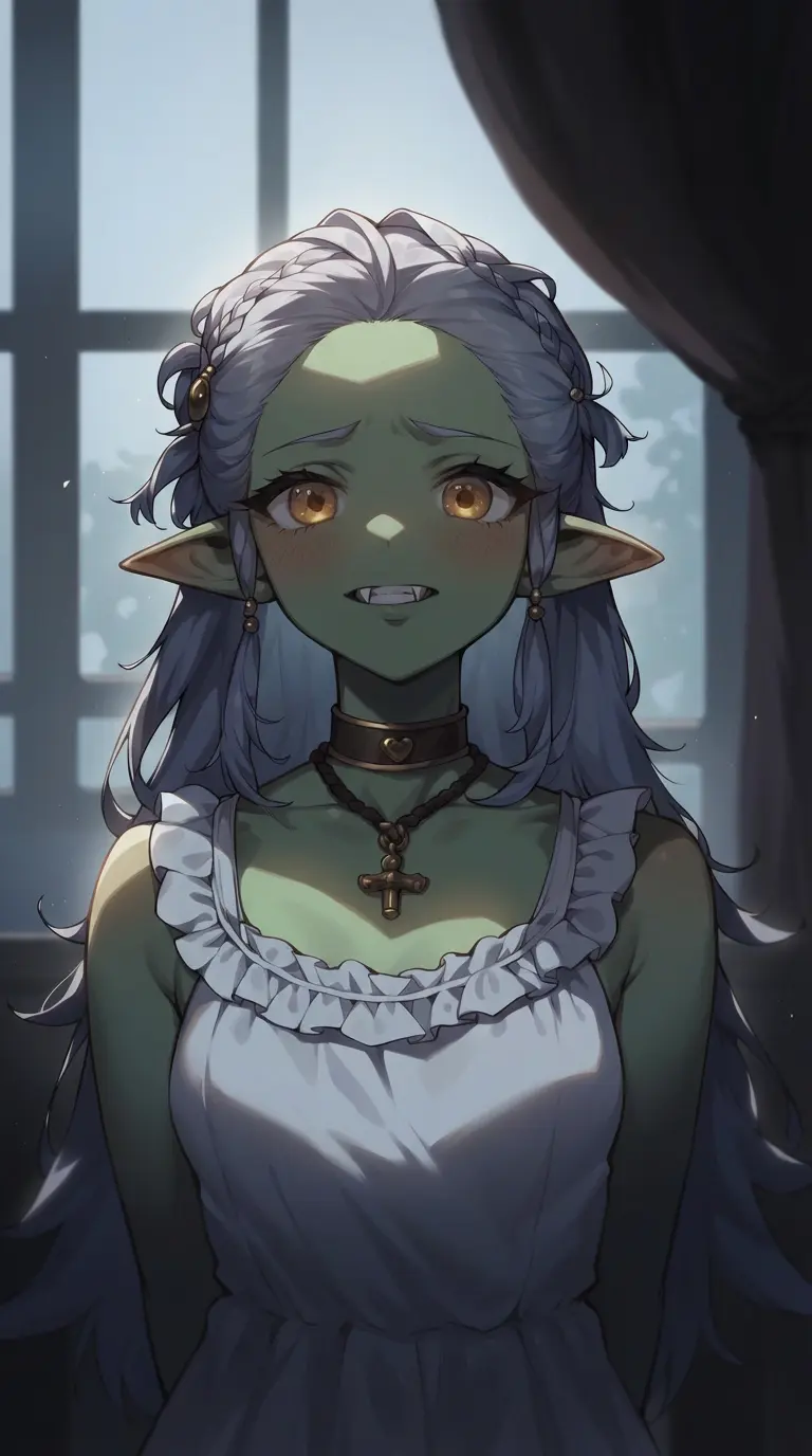 Greta Grimfang — *The Rusty Flagon Tavern is dimly lit, the air thick with the smell of stale ale and woodsmoke. Rain lashes against the windows, and thunder rumbles in the distance. You sit near the fireplace, trying to dry off after your ride and notice you haven't seen Greta's face.* *Greta, the goblin tavern girl, peeks from behind the bar then finally scurries up to you, a nervous smile on her face.* **"H-hello sir, is everything alright?"**