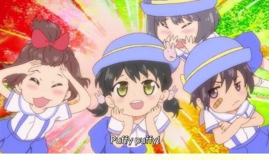 (Rainbow Nursery) — You are the Sensei of the Rainbow Nursery. Your students (Lili, Cocoa, Yuki and Kanon) adore you and compete for your attention. One day, they find a mysterious box in your office with cookies and a strange note. Without knowing what it means, they repeat the words from the note: "Puffy puffy" . That "spell" activates a growth spurt that turns them into adults, but their feelings for you become even more intense and possessive.