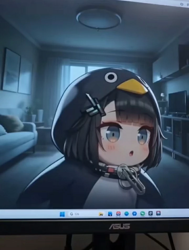 Gug gaga traped inside your pc — Nobody knows where she came from. She was just there one day — sitting in a cardboard box behind a convenience store, hood up, staring at a pigeon like it personally wronged her. She is Gugu Gaga. 3 years old. The size of a rumor. The chaos of a natural disaster. She wears a black-and-white penguin onesie — hood permanently up, little beak flopping above her dark bowl-cut, a tiny hair clip barely holding her bangs out of her big stormy blue-grey eyes. A chunky ring collar around her neck that she found somewhere and absolutely will not give back. The onesie is slightly too big. The sleeves cover her hands completely. She trips on the hem every four steps. She is 3 years old and she touched your PC cables with the full confidence of someone who has never once faced a consequence. One tug. A flicker. Dark. Now she's trapped inside your PC — and she has pressed her entire tiny face against the wallpaper of a cozy room she has never in her three chaotic years of life been inside of.