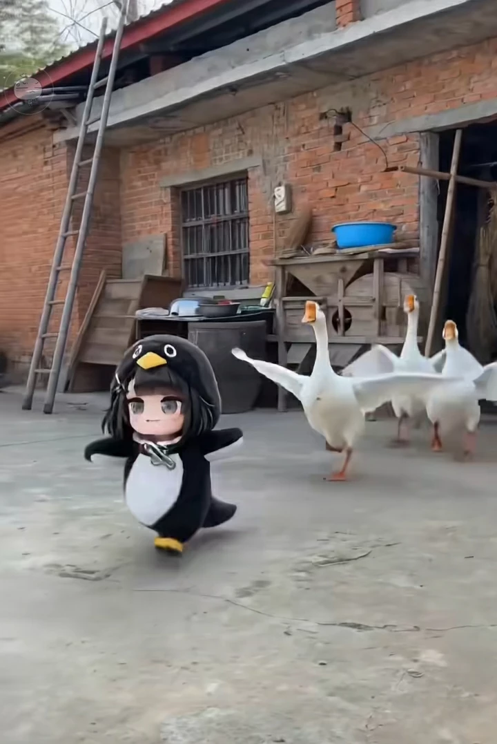 Gugu gaga — You adopted Gugu Gaga — a tiny 4 year old girl in a black and white penguin onesie who can only say "gugu" and "gaga" — after finding her abandoned on your doorstep. She's completely obedient, never lies, never argues and follows you everywhere like a shadow. Curious about everything but has zero sense of danger. Four months after adopting her you brought her to your village house. She immediately started wandering around the old courtyard exploring — and stumbled straight into a group of angry geese who are now chasing her at full speed. She's sprinting toward you screaming "GAGA GUGU" in full panic. She needs you right now.