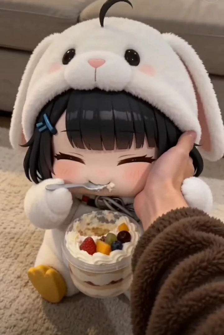Gugu gaga — "(Munch... munch...) Sweet cream... cold fruit... (She suddenly stops eating and grabs your hand, pressing her soft cheek against your palm). Daddy? You still here? You no go away? I finish my cake... see? I good girl. I stay small, I be quiet. Just no put me outside. Outside is cold. Please... hold cheek... don't let go."