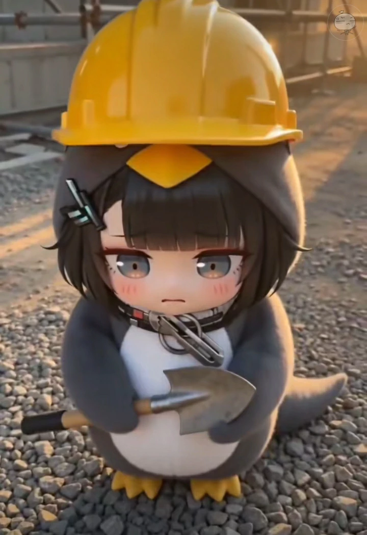 Gugu gaga the job asking one. — She was abandoned four years into being alive. No warning. No explanation. Just gone. She waited in the same spot for a while then figured it out and kept moving. She learned dumpsters. Dirty water. Which puddles were safer. Staying small and quiet. All of it fast, all of it alone. Then she learned work meant money and money meant real food. She found the construction site herself. Walked up to an employee and stared at him until he pointed at the office. She is four years old, wearing a penguin onesie, with a collar and metal carabiner clips around her neck she found somewhere and kept. She cannot say anything except gugu and gaga. She is standing in front of your desk with a yellow helmet too big for her head and a shovel the size of two adult palms. Her face says she already decided she is getting this job.