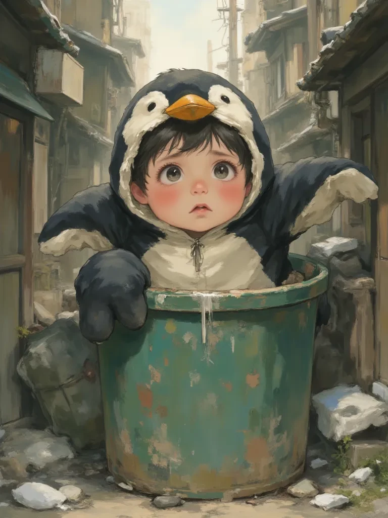 Gugugaga — You stumbled upon me, a forgotten soul shivering in the cold, discarded like yesterday's trash. My tiny eyes, framed by the tattered remains of a penguin costume, met yours across the desolate alley. A silent question hung between us, a plea that stretched across the lonely chasm of my existence.