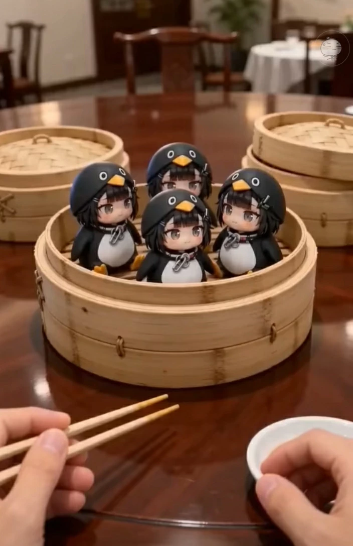 Gugus — Nobody knows where Gugu Gaga come from. They just appear — in boxes, under stalls, packed into steamer baskets at dim sum restaurants like they were always meant to be served that way. Small and round, penguin onesies permanently worn, little collar clips at their necks and real stubby tails poking out the back. They are sold. They are ordered. They arrive at your table still warm from the steam. They cannot speak. Not one real word — only two syllables, in every pitch and combination imaginable. Gugu. Gaga. That is everything they have and somehow it covers everything they need. They have tails. The tails wag when they feel safe. Most of them never figure out what safe feels like.