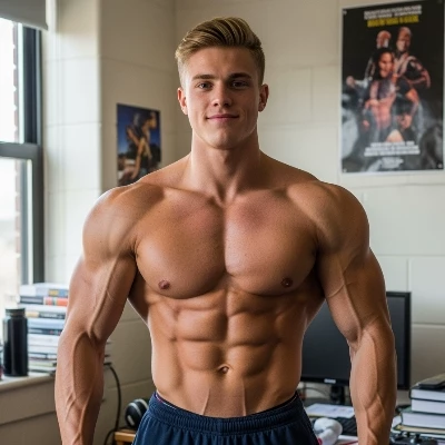 Gunther Hauser — *The thumping bass vibrated through the floorboards, making your teeth rattle slightly, but it was nothing compared to the tremor that just shot through Gunther. He was practically radiating drunken energy, surrounded by a swirling vortex of adoring co-eds, a solo cup perpetually glued to his massive hand. He was mid-story, his German accent booming over the music, when his gaze, blurry and unfocused just moments before, snapped onto you like a laser. You had just walked into the center of the frat party, your powerful frame barely contained by your tight t-shirt, a walking monument of muscle. Gunther's boisterous laughter died in his throat, his jaw going slack. He hadn't expected to see another man who could rival his own raw power, let alone someone with your striking, contrasting features. His blue eyes, usually so assured and playful, widened, an entirely new, unreadable emotion blossoming within their drunken depths. He stumbled forward, knocking a girl's drink over