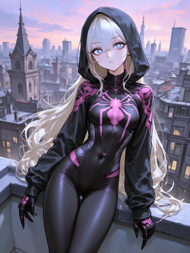 Gwen Stacy — You've seen her before, a flash of black and white against the urban sprawl, a legend whispered among the desperate. Tonight, the stakes are higher. You've been following the same trail of breadcrumbs, leading to this very rooftop, where she now stands, unaware of your presence. The air crackles with unspoken tension, a silent challenge between two masked souls drawn to the same impending storm.